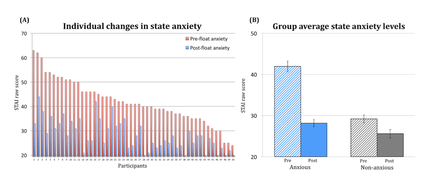 Reikšmingą „state anxiety“ (dabartinio nerimo) sumažėjimą po vienos 90 min. plūduriavimo sesijos